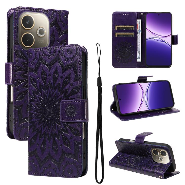 Funda de Cuero con Tapa y Estampado de Girasoles En Relieve para Oppo A5 Pro 5G (Morado)