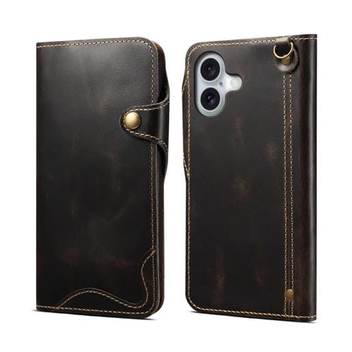 Funda de Piel de Vaca Denior B01 para iPhone 16 con Botón Magnético y Cera de Aceite (Negra)