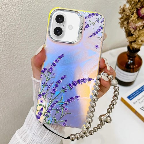 Funda para Teléfono iPhone 16 Plus Flor Láser Galvanizada con Correa para Muñeca (Lavender)