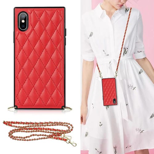 Funda para iPhone X Xs Cuero de Microfibra TPU Patrón Rómbico a Prueba de Golpes con Cadena (Rojo)