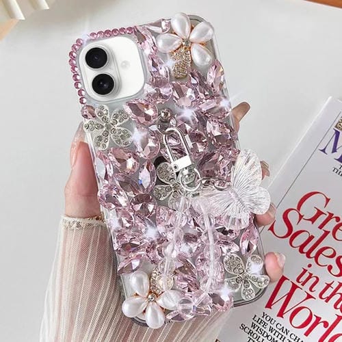 Funda para iPhone 16 hecha a mano con incrustaciones de diamantes y mariposas (Rosa)