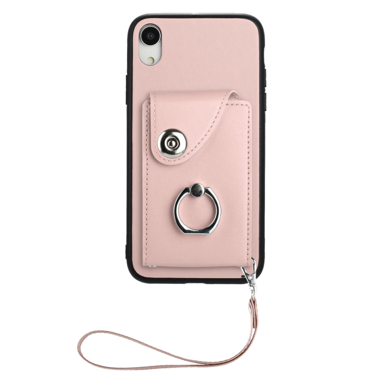 Funda para Teléfono iPhone Xr PU con Soporte para Anillo y Bolsa para Tarjeta con Cordón (Rosa)