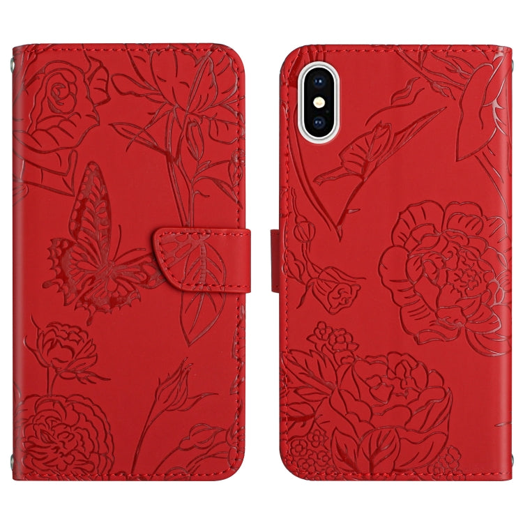 Funda de Cuero Skin Feel para iPhone X / Xs Butterfly Peony en Relieve (Rojo)