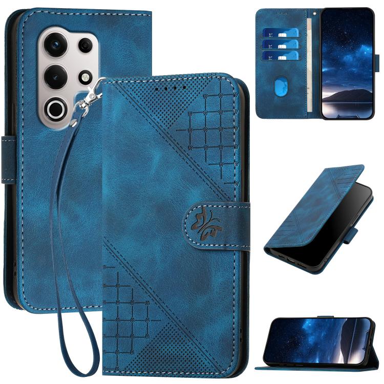 Funda de Cuero Itel S25 Ultra con Diseño Mariposa en Relieve y Cordón (Azul Oscuro)