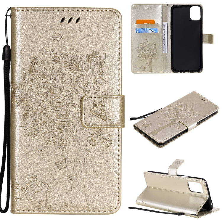 Funda Cuero PU para LG K42 con Impresión Tree & CAT, Titular, Tragamonedas, Billetera y Cordón (Oro)