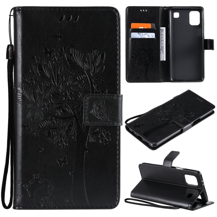 Funda Cuero PU LG K52 Árbol y Gato Patrón Impresión Prensada Horizontal con Soporte y Ranuras (Negro)