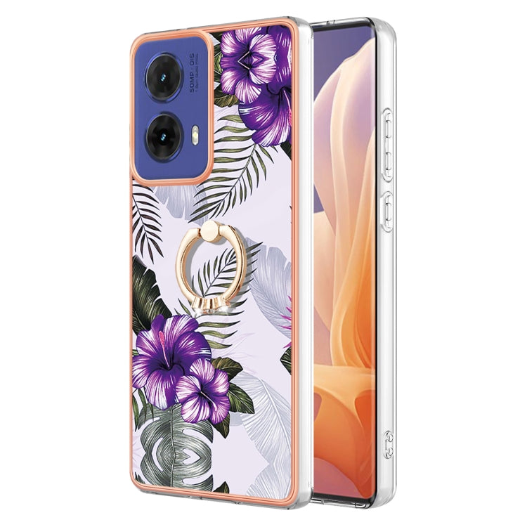 Funda TPU con Patrón Galvanoplastia y Soporte Anillo para Motorola Moto G85 (Flor Morada)