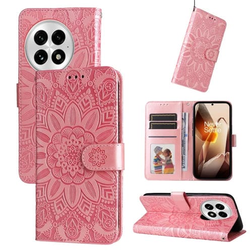 Funda de Piel para OnePlus 13 con Diseño de Girasol en Relieve (Oro Rosa)