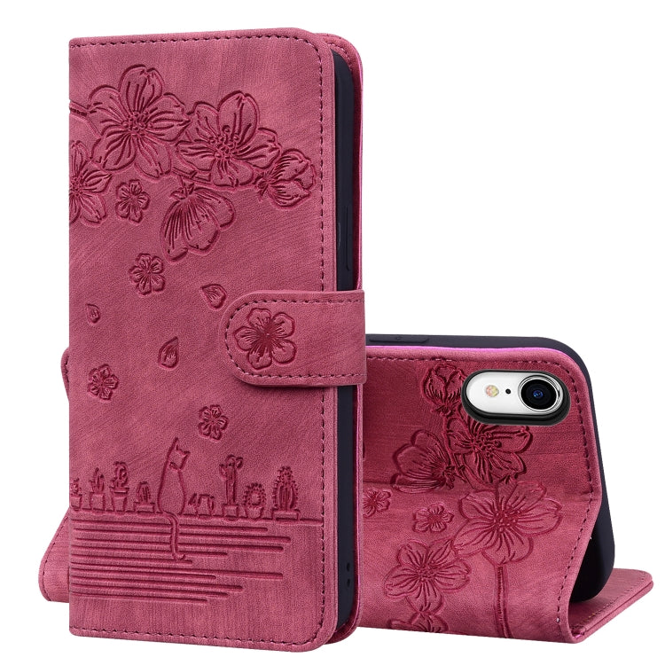Estuche de Cuero para iPhone Xr Cartoon Sakura Cat En Relieve (Rojo Vino)