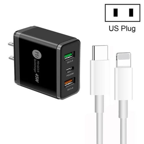 Cargador USB Multipuerto 45W Pd3.0 + 2x Qc3.0 con Cable Tipo C a 8 Pines (Negro)