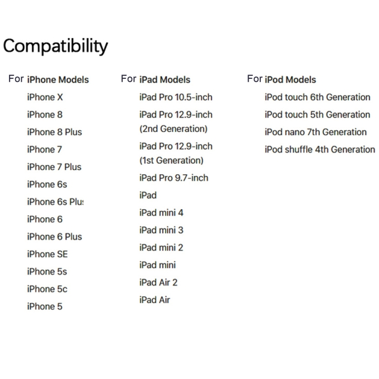4. Adecuado para: Adecuado para iPad Mini 1/2/3/4 Series, iPad Pro Series, iPod Nano / Touch Series, Serie de iPhone.