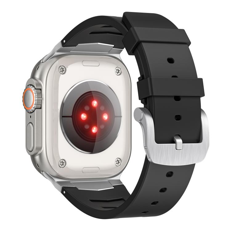 Correa de caucho fluorado con hebilla de acero inoxidable para Apple Watch Ultra/Ultra 2 de 49 mm (negro y plateado)