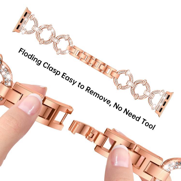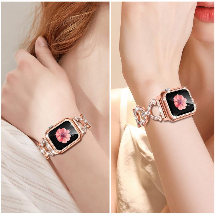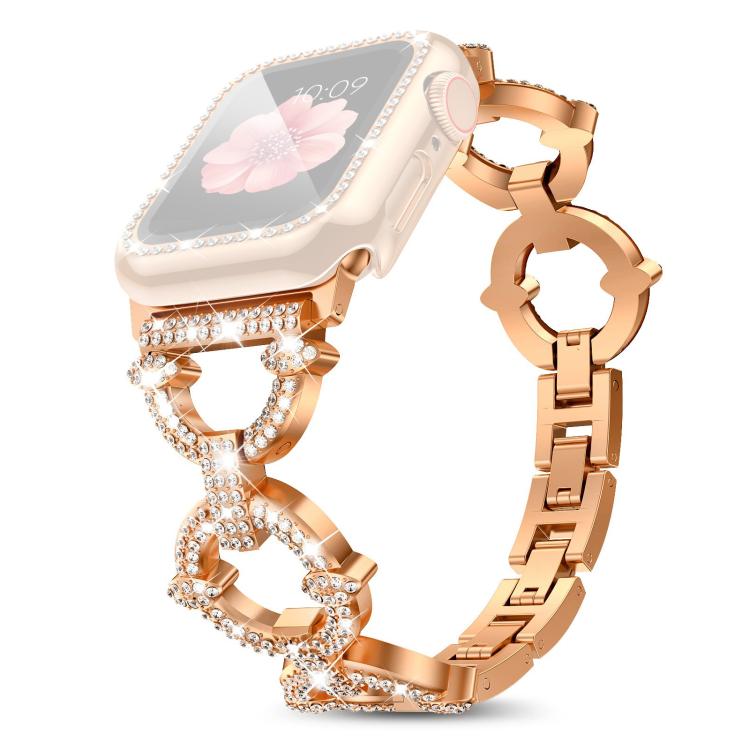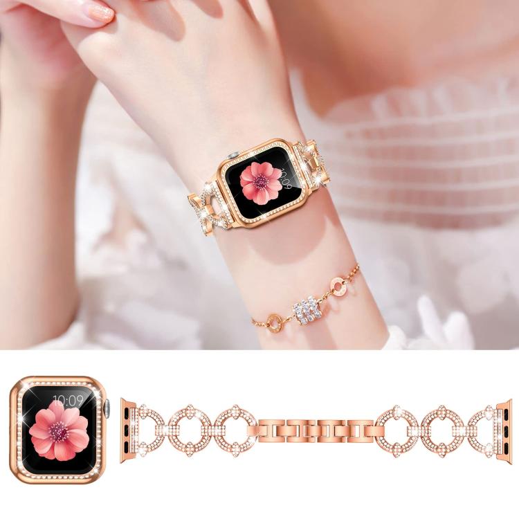 Correa de metal con diamantes en forma de O para Apple Watch Series 41 mm xDfind con película templada y cubierta de PC integrada (oro rosa)