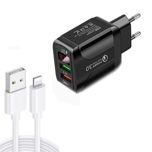Cargador rápido + Cable de datos USB A 8 Pin F002C QC3.0 USB + USB 2.0 Pantalla digital (Negro)