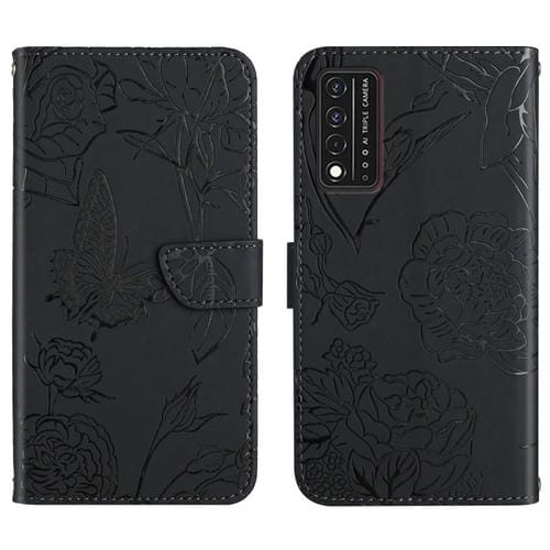 Funda para T-Mobile Revvl V+ 5G con piel sintética y diseño relieve Mariposa Peonía (Negra)
