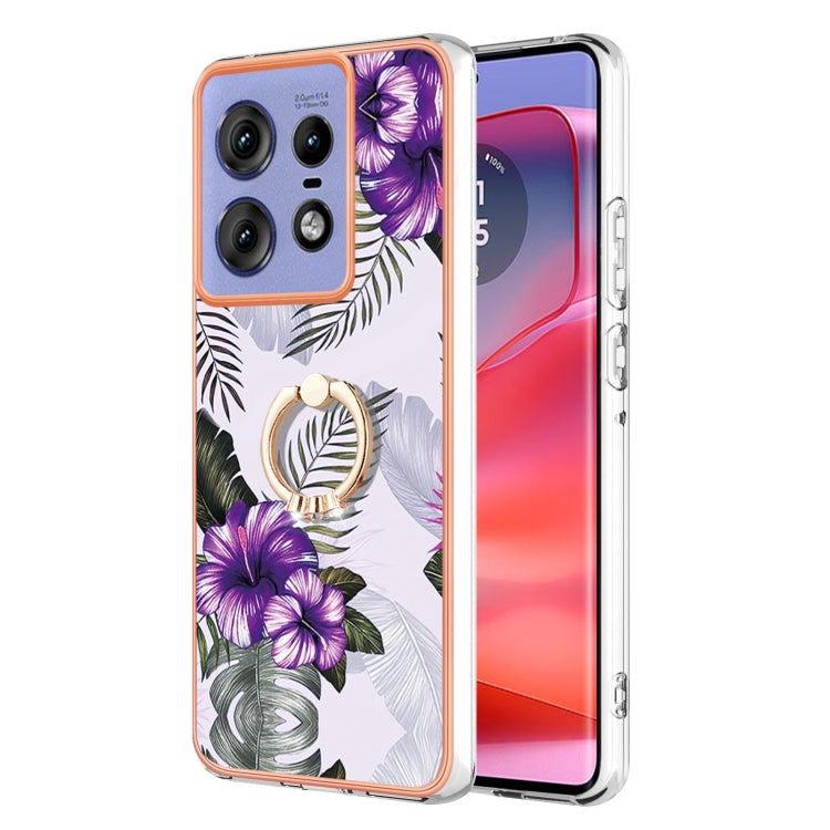Funda TPU Motorola Edge 50 Pro a Prueba de Golpes con Patrón Galvanoplastia y Soporte Anillo (Flor Morada)