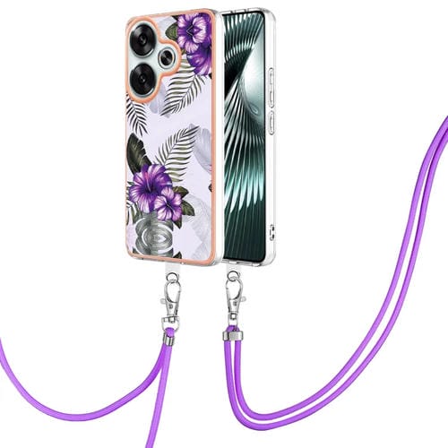 Funda a Prueba de Golpes con Patrón de Galvanoplastia Imd TPU para Xiaomi Poco F6 5G con Cordón para El Cuello (Flor Morada)