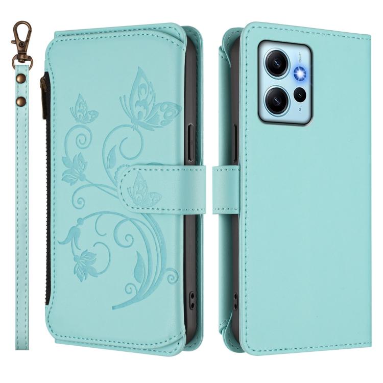 Funda de cuero con cremallera para Redmi Note 12 4G Global, diseño de mariposas, flores y amor, con múltiples tarjetas (verde menta)
