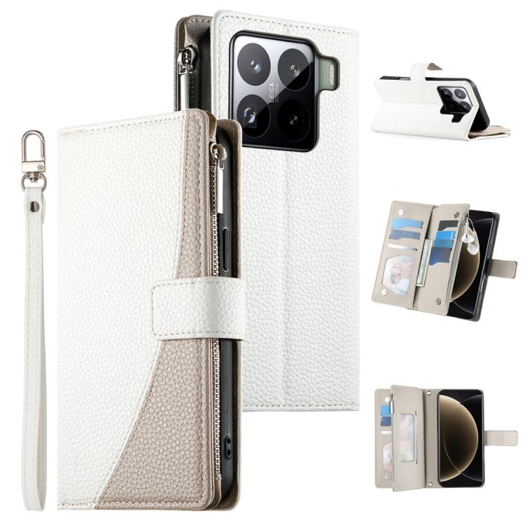 Funda de cuero con cremallera para Xiaomi 15 Pro, con múltiples tarjetas y costuras, con correa corta (blanca)