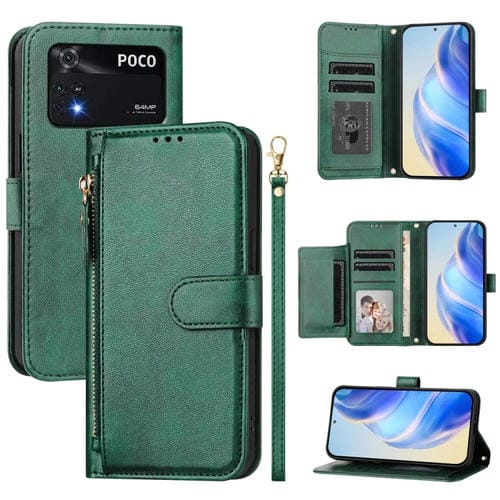 Funda de Cuero con Cremallera y Ranuras para Múltiples Tarjetas para Xiaomi Poco M4 Pro 4G (Verde)