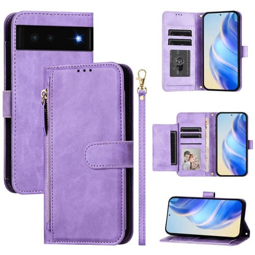 Funda de Cuero con Cremallera y Ranuras para Tarjetas para Google Pixel 6 (Morado)