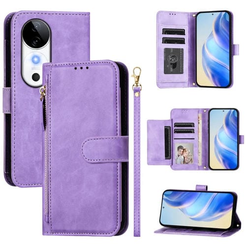 Funda de Cuero con Cremallera y Ranuras para Varias Tarjetas para Vivo S19 (Morado)