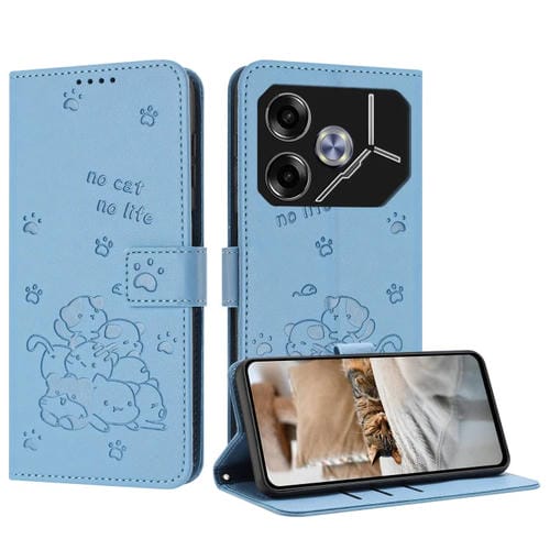 Funda de Cuero para Tecno Pova 6 Pro y Pova 6 5G con Diseño de Gatito en Relieve y Cordón (Azul)