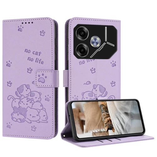 Funda de Cuero para Tecno Pova 6 Pro y Pova 6 5G con Diseño de Gatito en Relieve y Cordón (Morado)