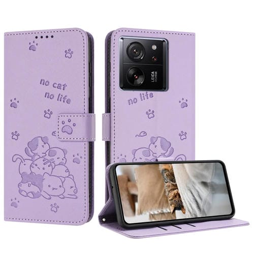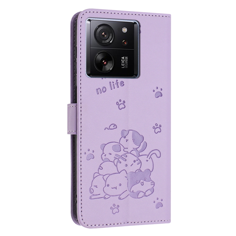 Funda de Piel con Diseño de Gatito En Relieve y Cordón para Xiaomi 13T/13T Pro (Morado)
