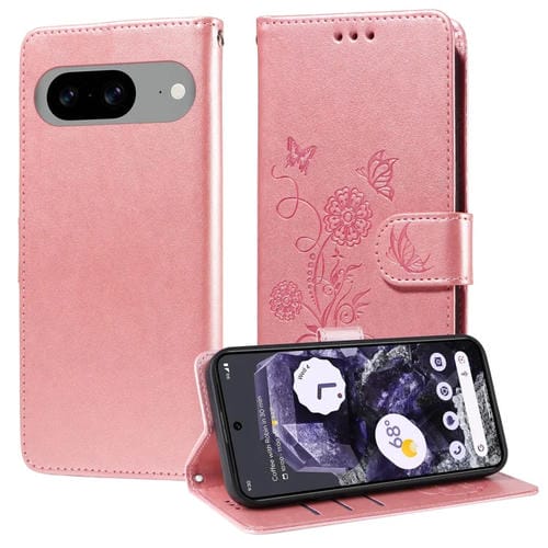 Funda de Cuero para Google Pixel 8 con Diseño de Mariposas y Flores en Relieve (Oro Rosa)