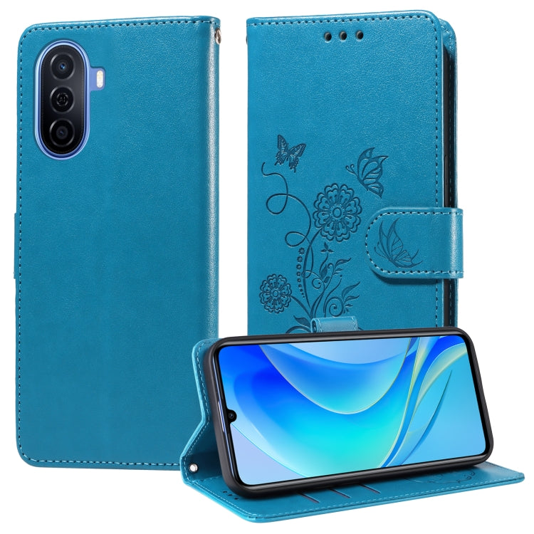 Funda de Cuero Huawei Nova Y70 Plus con Diseño de Mariposas y Flores en Relieve (Azul)