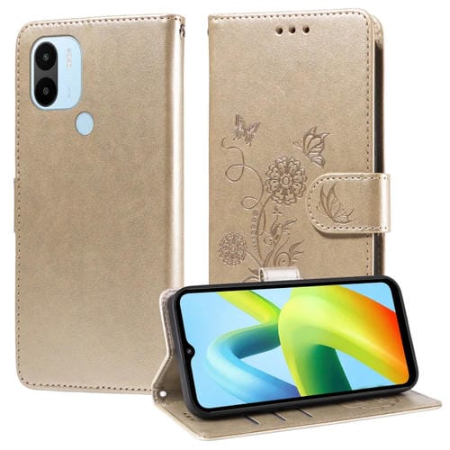 Funda de Cuero con Diseño de Mariposas y Flores En Relieve para Redmi A1 Plus/A2 Plus (Dorada)