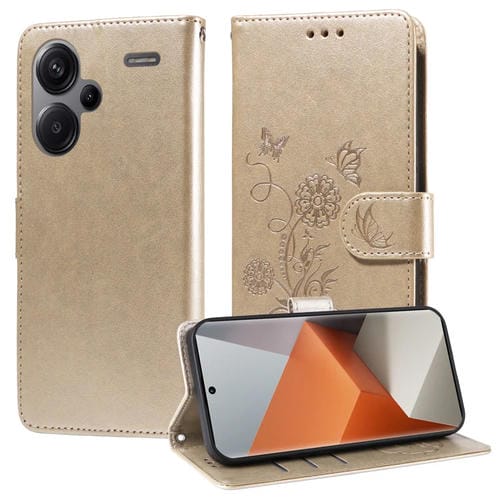 Funda de Cuero con Diseño de Mariposas y Flores En Relieve para Redmi Note 13 Pro+ 5G (Dorada)