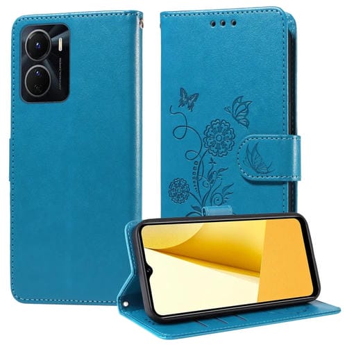 Funda de Cuero con Diseño de Mariposas y Flores En Relieve para Vivo Y16 4G / Y02S / Y56 5G (Azul)