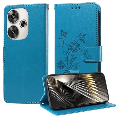 Funda de Cuero con Diseño de Mariposas y Flores En Relieve para Xiaomi Poco F6 (Azul)