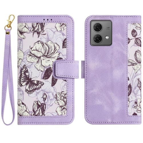Funda de Cuero con Estampado Floral para Motorola Moto G84 con Cordón (Morado Claro)