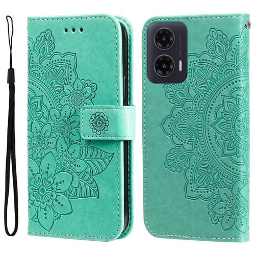 Funda de Cuero con Relieve Flores Siete Pétalos para Motorola Moto G35 (Verde)