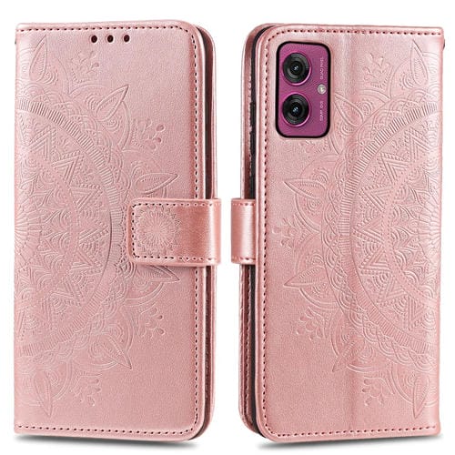 Funda de Cuero Motorola Moto G55 con Relieve de Flores y Tótem con Cordón (Oro Rosa)