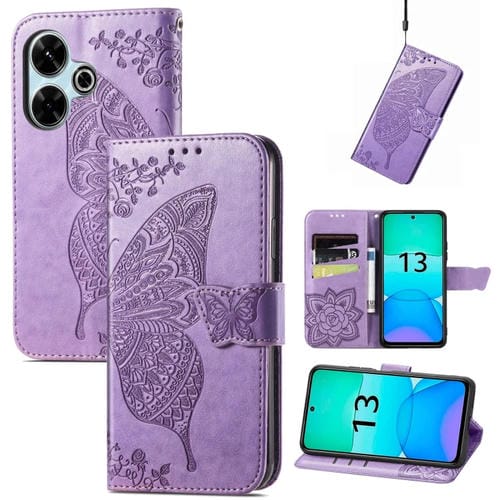 Funda de Cuero con Relieve de Mariposa y Flor para Xiaomi Redmi 13 4G (Lavanda)