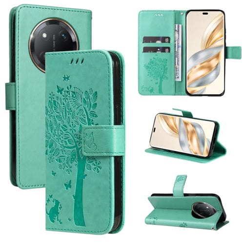 Funda de Cuero con Tapa para Honor X9C 5G Global con Estampado de Árbol y Gato (Verde)