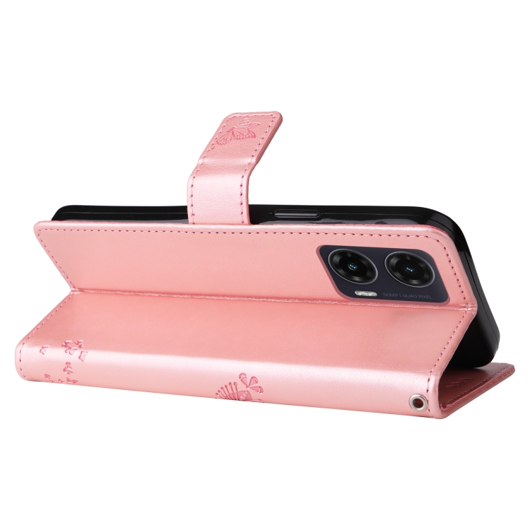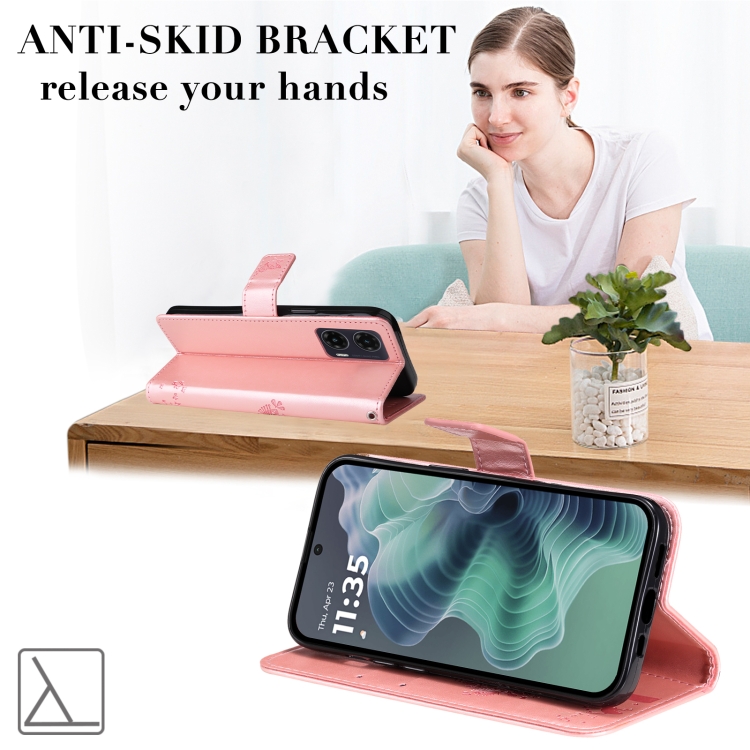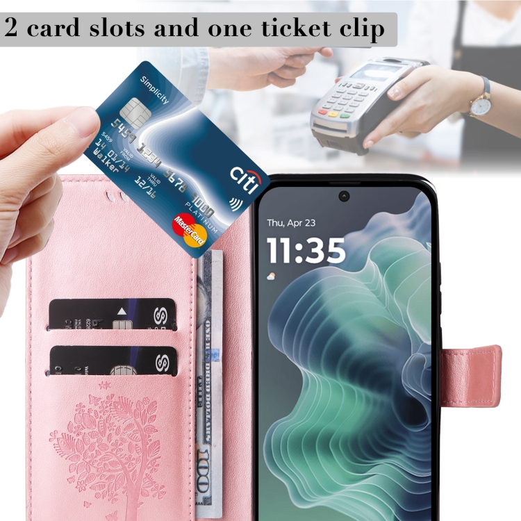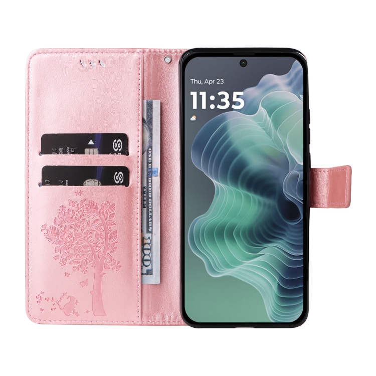 Funda de Cuero con Tapa para Motorola Moto G35 con Diseño Árbol y Gato en Relieve (Oro Rosa)