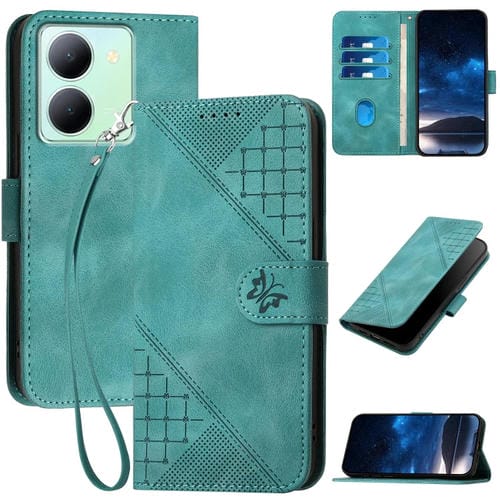 Funda de Cuero con Tapa y Cordón para Vivo Y27S 4G Global Yx0080 con Diseño En Relieve de Mariposa y Cuadrícula (Azul Claro)
