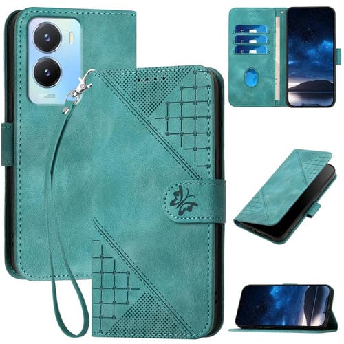 Funda de Cuero con Tapa y Cordón para Vivo Y56 5G Global Yx0080 con Diseño En Relieve de Mariposa y Cuadrícula (Azul Claro)