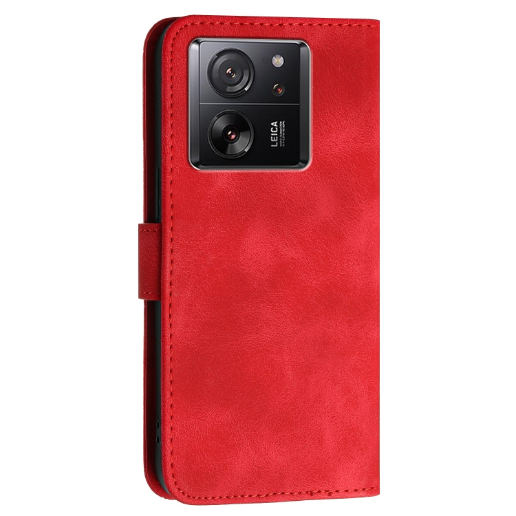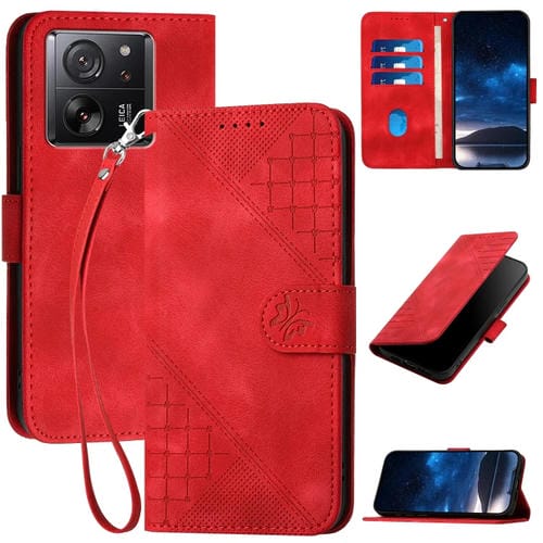Funda de Cuero con Tapa y Cordón para Xiaomi 13T Yx0080 con Diseño de Mariposa En Relieve y Cuadrícula (Rojo)