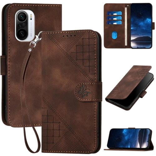 Funda de Cuero con Tapa y Cordón para Xiaomi Poco F3 Yx0080 con Diseño En Relieve de Mariposas y Cuadrícula (Café)
