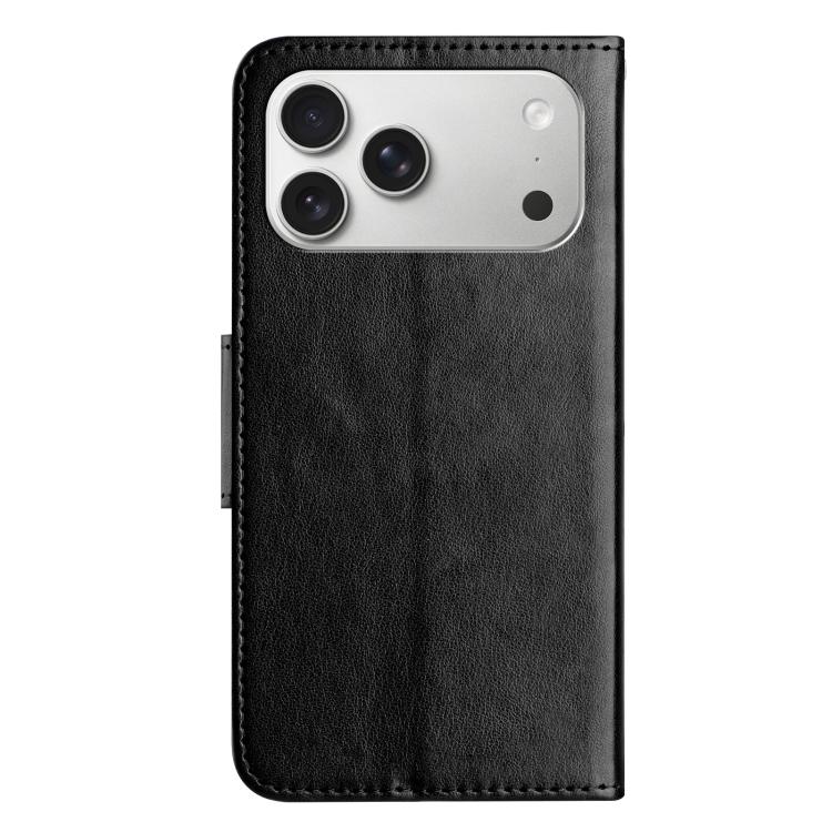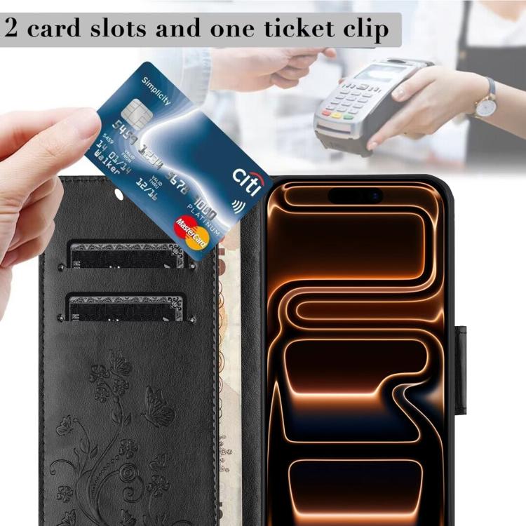 Funda de cuero con tapa y diseño de mariposas y flores para iPhone 17 Pro (negra)