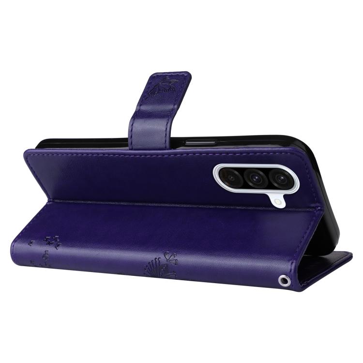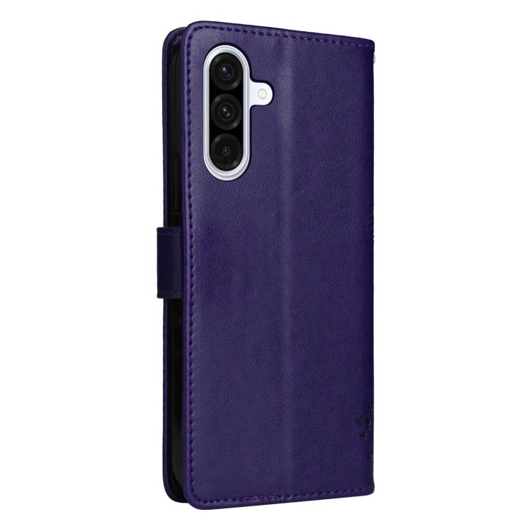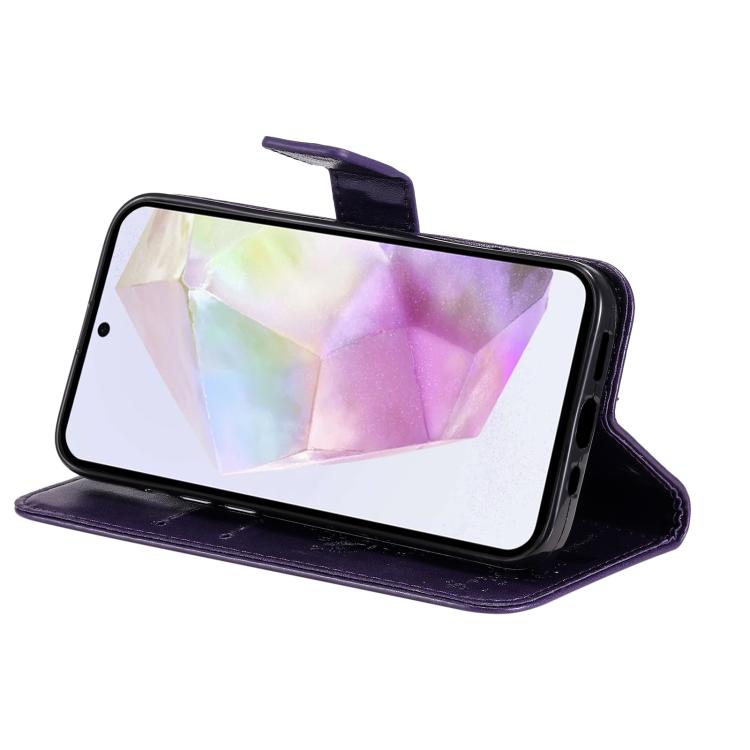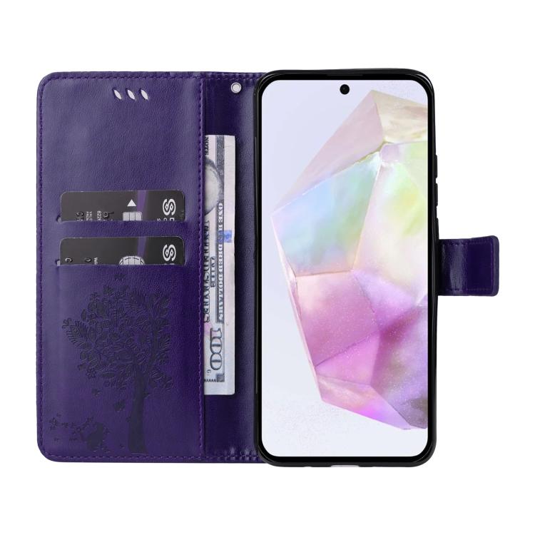 Funda de cuero con tapa y estampado de árbol y gato para Samsung Galaxy A56 5G (morado)