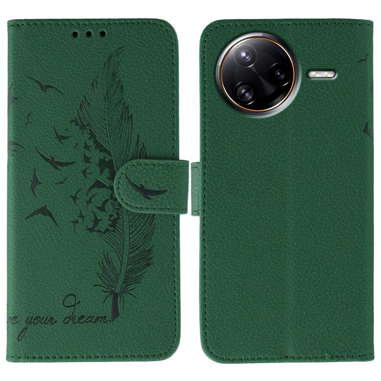 Funda de cuero con textura de lichi y estampado de plumas para Xiaomi Poco F7 Ultra / Redmi K80 Pro (verde)
