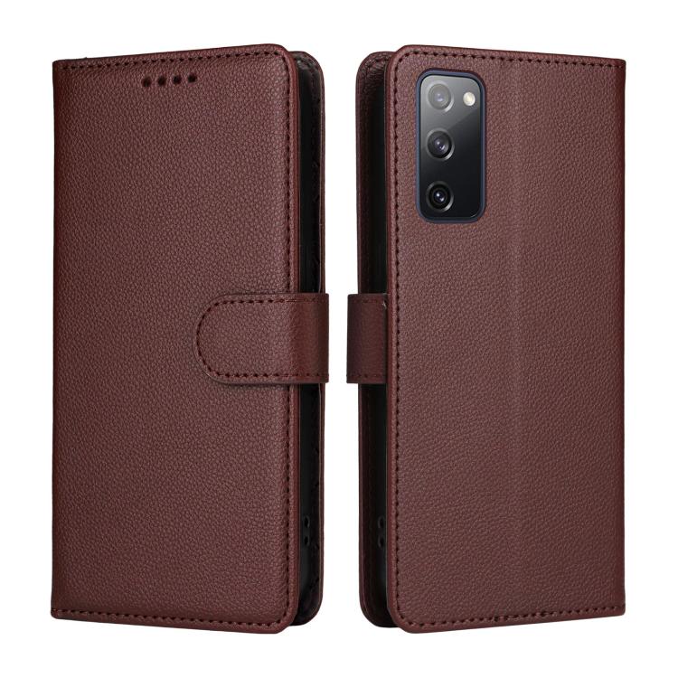 Funda de cuero con textura Litchi para Samsung Galaxy S20 FE, con bloqueo RFID y capacidad para 3 tarjetas (marrón)