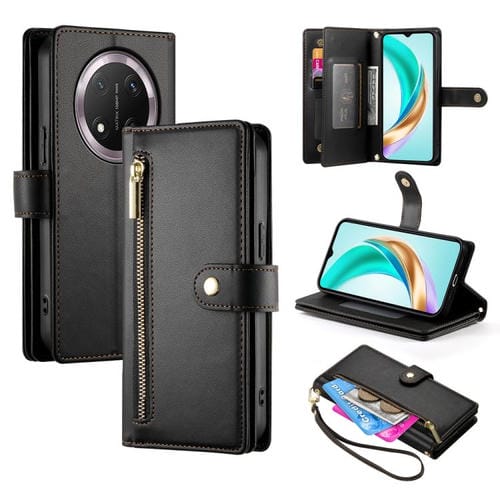 Funda de Cuero para Honor X9C Global y Magic7 Lite con 9 Ranuras para Tarjetas y Cremallera (Negro)